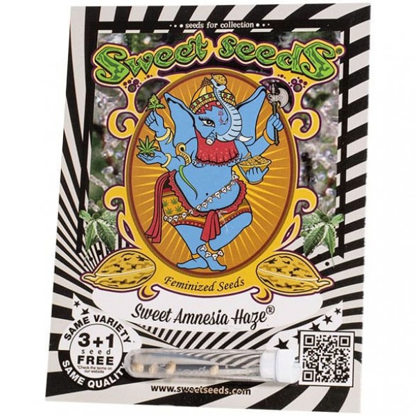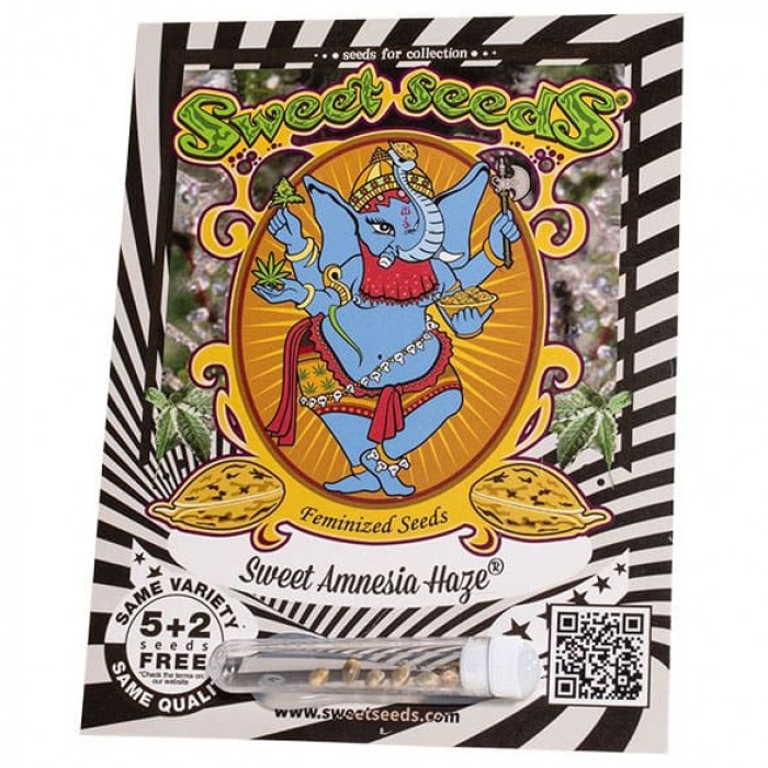 Sweet Amnesia Haze feminised від сідбанку Sweet Seeds - це унікальний сативний сорт, що поєднує потужний вплив (рівень тетрагідроканабінолу в ньому 22%), швидку швидкість цвітіння і високу врожайність. Він отримав визнання у всьому світі, в тому числі завоював престижну нагороду 1-ше місце на VI Copa Cata del Oeste, (Буенос-Айрес, Аргентина, 2019).